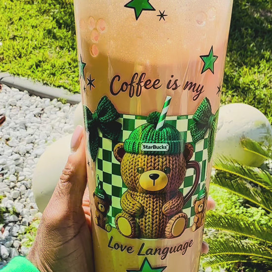 “Coffee Is My Love Language” tumbler featuring an adorable teddy bear design with glitter finish. Perfect for iced coffee, cold drinks, and everyday use. Comes with lid and straw — a fun gift for coffee lovers, besties, or yourself!