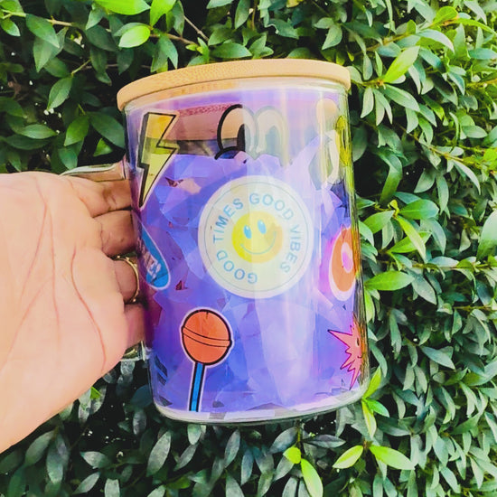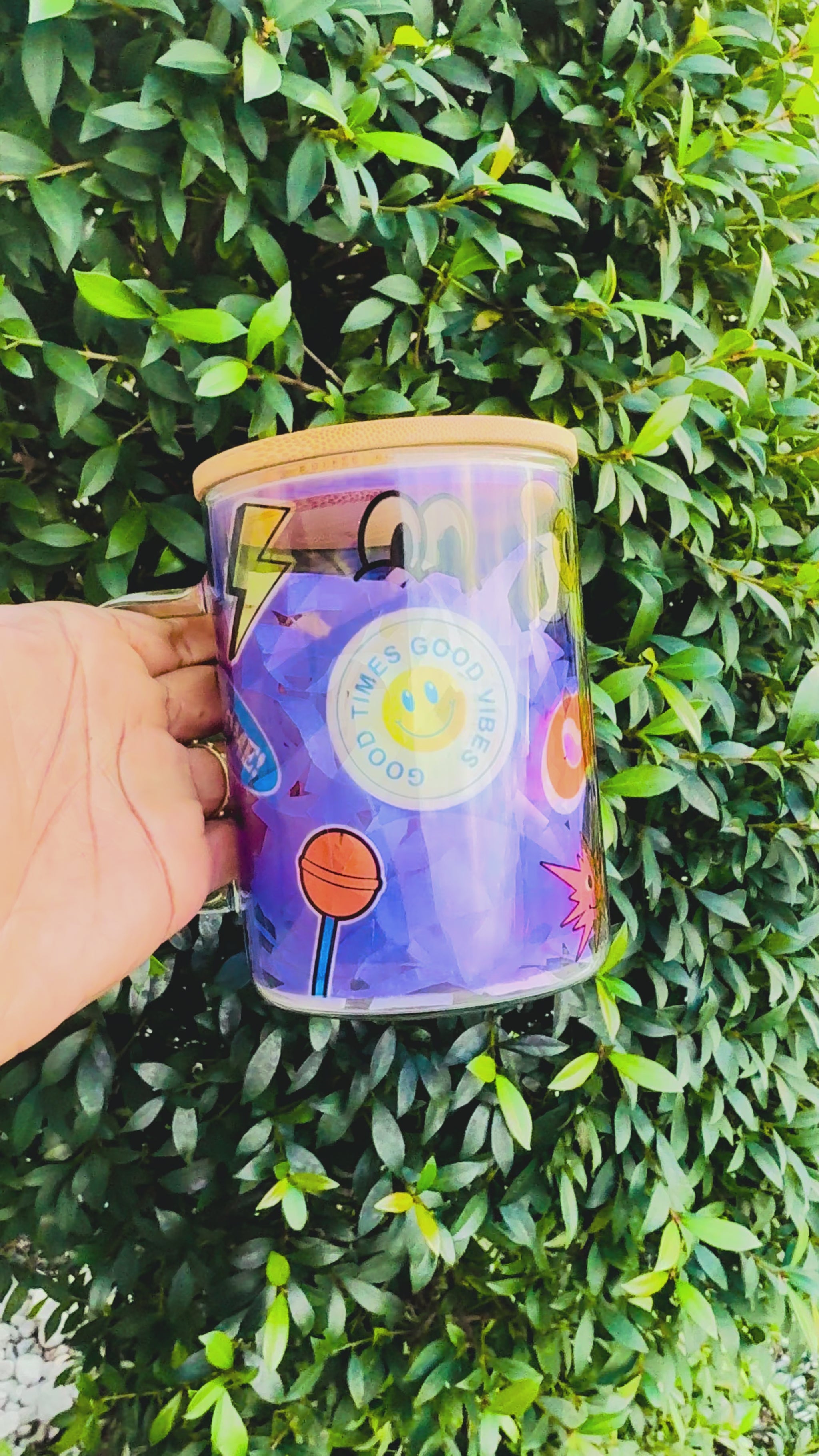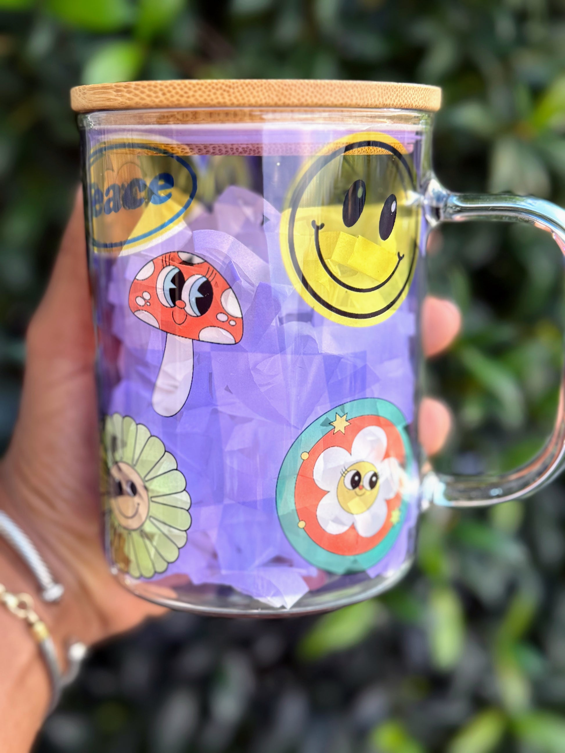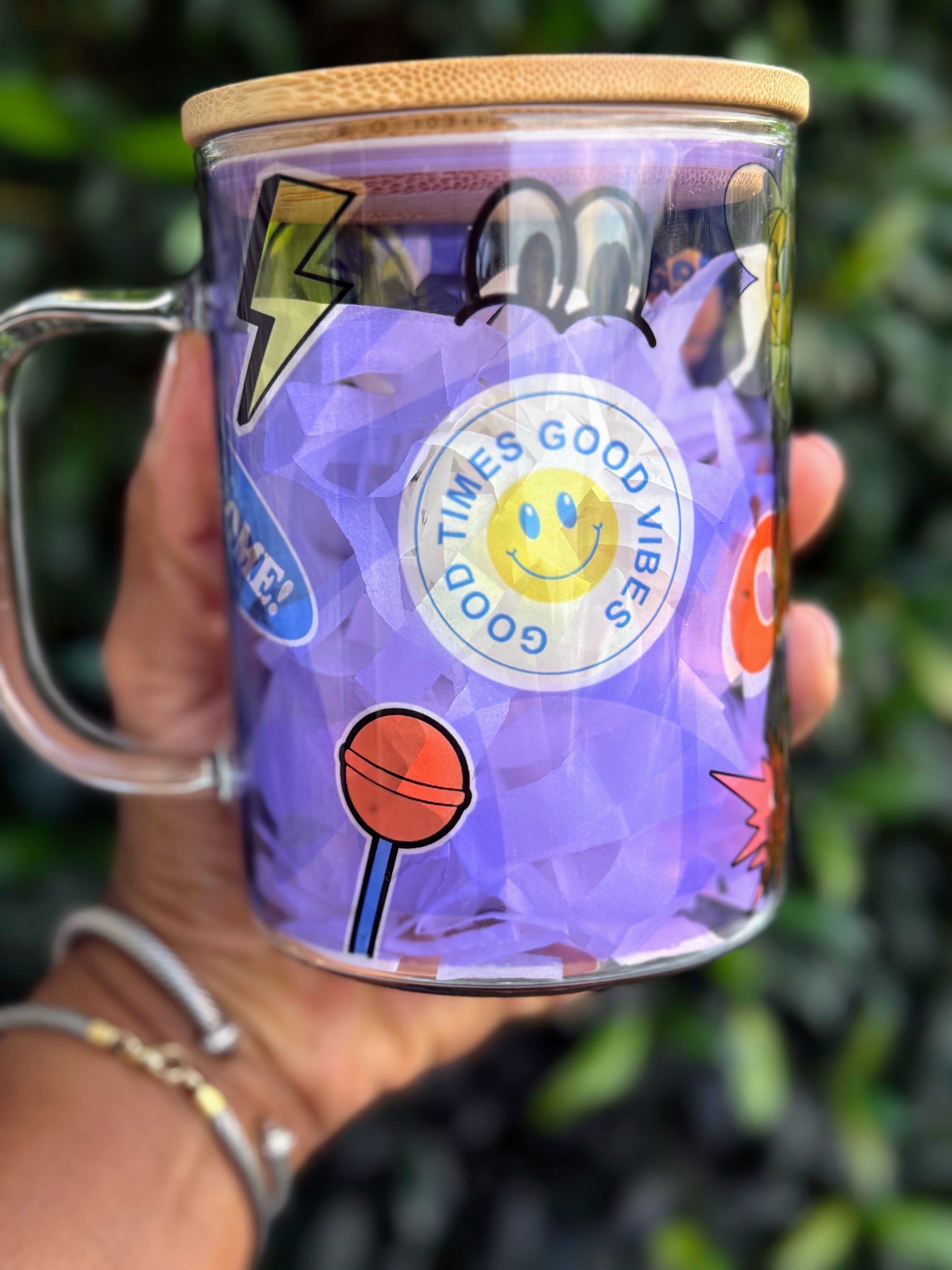 Capacity: 16oz, Material: glass, Design: Retro smiley flowers with “Cool!” text, Includes: bamboo lid + reusable straw, reusable and eco-friendly, Great for iced coffee, smoothies, water, or tea.